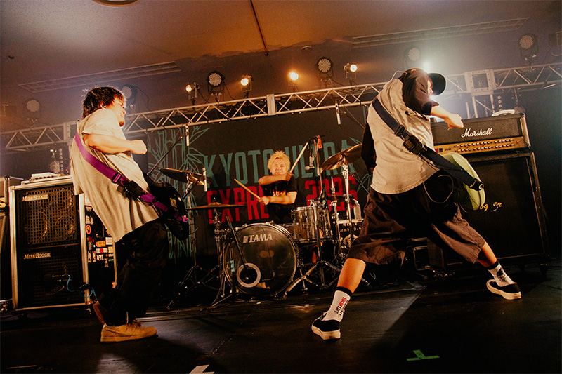 軽快かつメロディアスなサウンドでオーディエンスを存分に暴れさせたSHANK。先週は彼らが主催するフェス“BLAZE UP NAGASAKI 2025”にROTTENGRAFFTYが出演し、そして今週はROTTENGRAFFTY主催の“響都超特急2025”にSHANKが出演ということで、イベント主催というお互いの期待に応えるように、全力で熱いライブを展開して会場の盛り上がりを加速させていく。「Departure」「Two sweet coffees a day」「620」「Weather is Beautiful」とライブキッズ垂涎の名曲を連射して何度もダイバーを打ち上げた後、「ROTTENGRAFFTYありがとうございます!」と頭を下げた庵原将平(Vo./Ba.) 。その流れで「NOBUYAさん殺すとか言わないほうがいいですよ。愛情を受けずに育ったので言っちゃうんでしょうね(笑)。代わりに謝っておきます。ごめんなさいね」と言って会場を沸かせる。