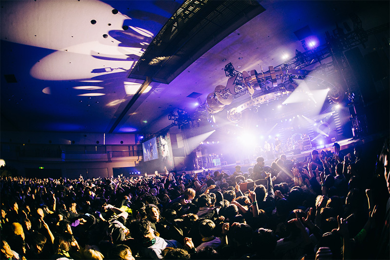 金閣のトップバッターは昨年出演が急遽出来なくなったTHE ORAL CIGARETTES。メンバーがステージに登場する前からオーディエンスは準備万端、SEに合わせてクラップの波が自然発生し、メンバー登場で会場のボルテージは最高潮に到達。