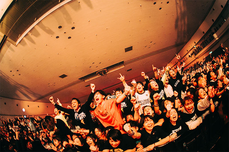 観客全員の大合唱で始まった「金色グラフティー」でNOBUYAは客席エリアを睨みつけて「今日初めて言うわ…ダイバーの数、多すぎるやろコラ!」と怒りの声をあげて「いつもありがとう」と言葉を添える。N∀OKIの「輝き狂え!」で演奏スタートした同曲は、まじでダイバーの数が多すぎで、曲が終わるまでずっとその状態のまま。そして本編は「秋桜」で駆け抜けて本編終了。